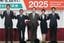 自民党総裁選の共同記者会見を前に、写真に納まる(左から)小林鷹之元経済安全保障担当相、茂木敏充前幹事長、林芳正官房長官、高市早苗前経済安全保障担当相、小泉進次郎農林水産相=23日午前、東京・永田町の同党本部