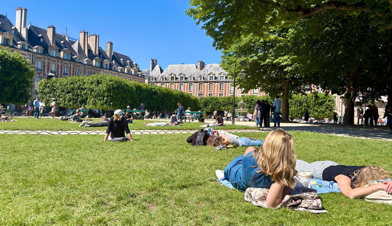 パリで最も古い広場(ヴォージュ広場) パリの公園や広場の多くの芝生では寝転んだり、ピクニックをしたり、誰でも自由に過ごせる。