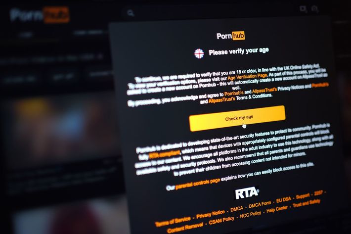 2025年7月25日、ロンドンのノートパソコンで、成人向けオンラインサイトが利用者の年齢確認を求める画面