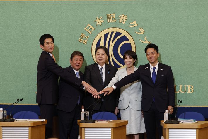 自民党総裁選の立候補者討論会で、写真に納まる(左から)小林元経済安保相、茂木前幹事長、林官房長官、高市前経済安保相、小泉農相=2025年9月24日午後、東京・内幸町の日本記者クラブ