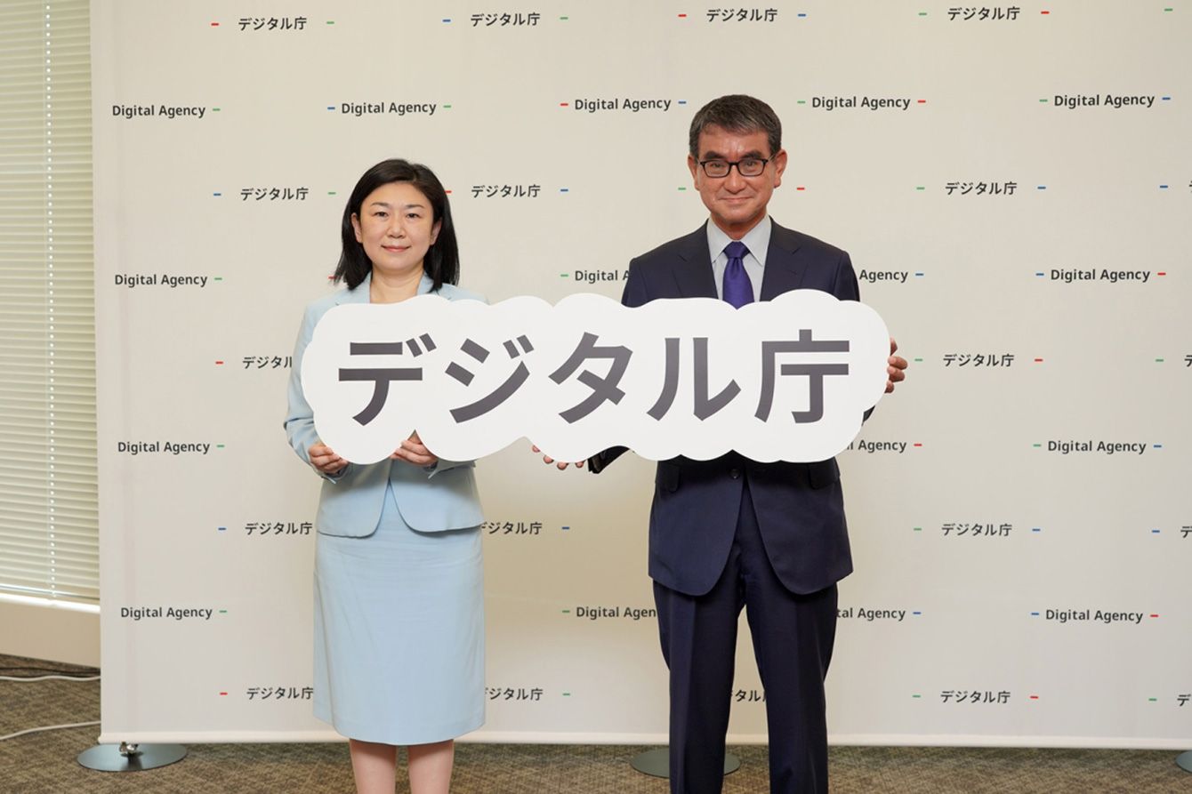 デジタル庁政務三役退任式・就任式。左から牧島かれん(旧)、河野太郎(新)(写真=デジタル庁/CC-BY-4.0/