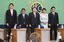 日本記者クラブ主催の自民党総裁選立候補者討論会で、写真に納まる(左から)小林鷹之元経済安全保障担当相、茂木敏充前幹事長、林芳正官房長官、高市早苗前経済安全保障担当相、小泉進次郎農林水産相=2025年9月24日、東京都千代田区[代表撮影]