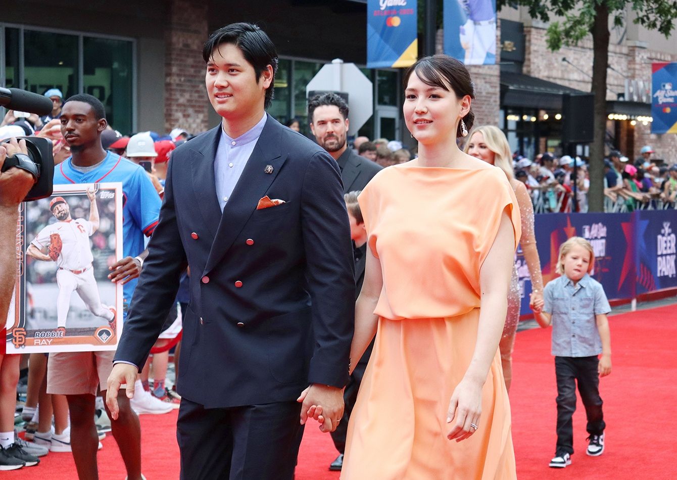 オールスター戦前にレッドカーペットを歩く恒例行事に参加したドジャースの大谷翔平(左)と妻の真美子さん=2025年7月15日、アメリカ・アトランタ