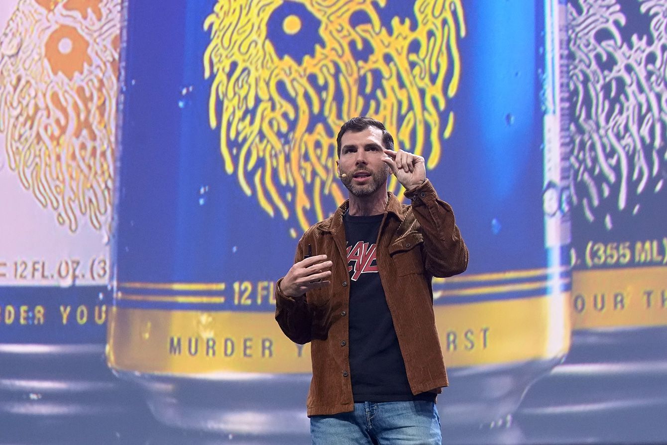 OMRデジタル&マーケティング見本市で講演するリキッド・デス社の創業者兼CEOのマイク・セサリオ氏=2025年5月6日、ハンブルク