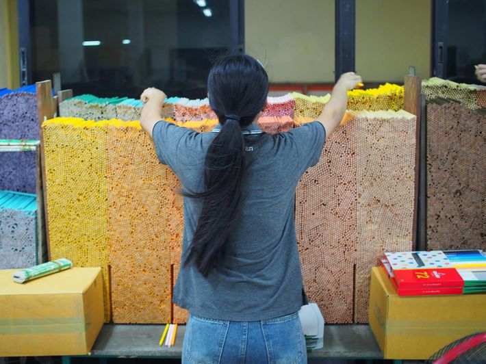 箱詰めに備え、色ごとに仕分けられた色鉛筆
