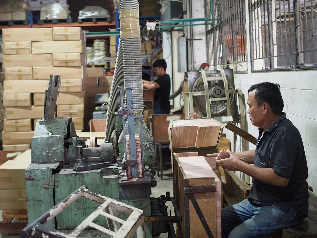 鉛筆の軸となる木材を加工する工程。熟練工の手作業が品質を支える