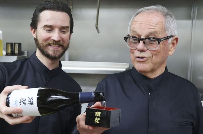 2025年2月27日、米ロサンゼルスで、ウルフギャング・パックさん(右)に清酒「獺祭ブルー」を注ぐ息子のバイロンさん