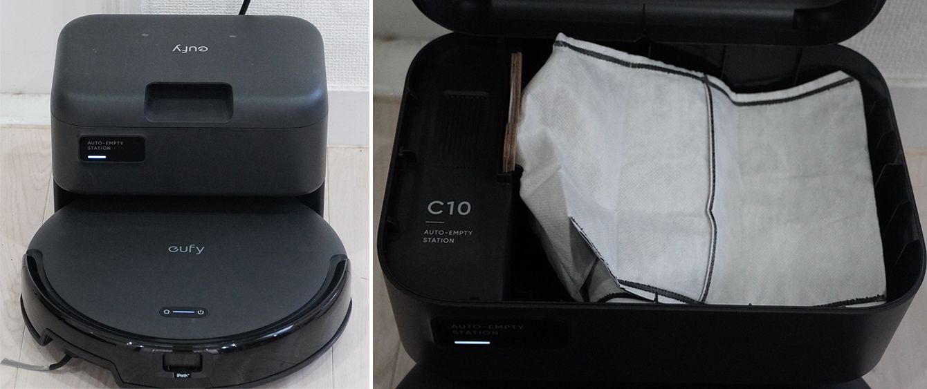 左)アンカーは、自動ゴミ収集ステーションがあるので充電台の部分が大きめ。とはいえ、他社と比べるとかなり小さい 右)充電ステーションに格納されている紙パック。ここにゴミを溜めておける