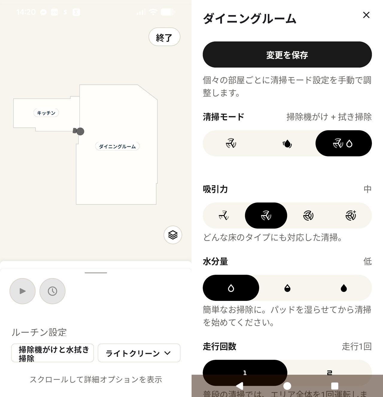 数分でできるマップ。部屋の指定を行ったり、掃除機がけ・水拭きなどの設定ができる