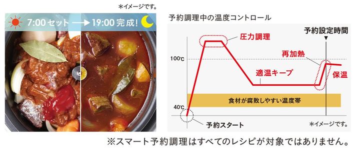 朝、セットして夜に完成させるスマート予約機能も用意。最大12時間の予約ができ、圧力調理した後に食材が傷みやすい温度帯にならないよう保温しながら調理する
