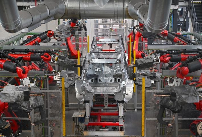 ギガファクトリー・ベルリン。電気自動車「テスラ・モデルY」を組み立てている