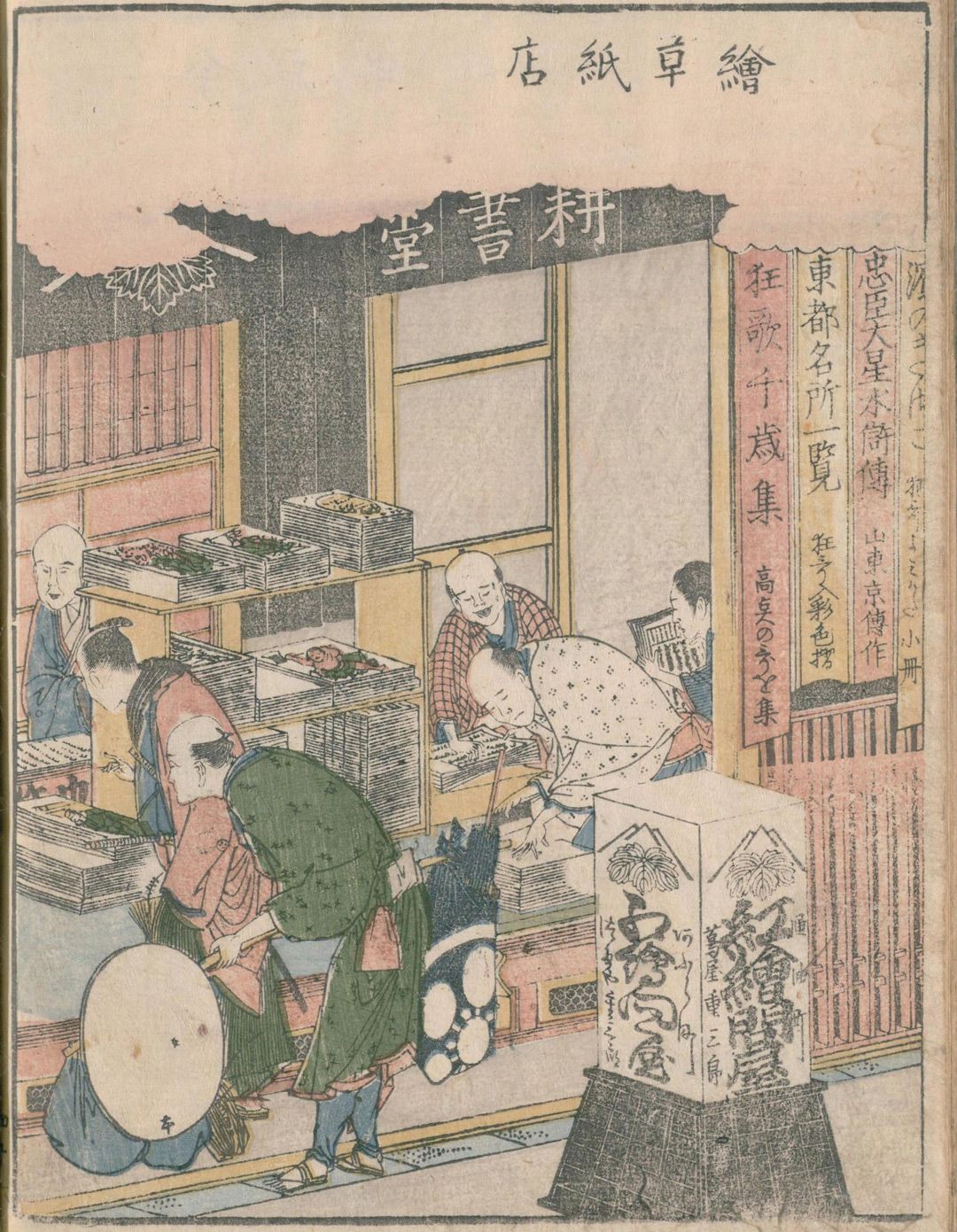 浅草庵作、葛飾北斎画『画本東都遊 3巻』に登場する日本橋の耕書堂、享和2年(1802)、初版は1799年。出典=