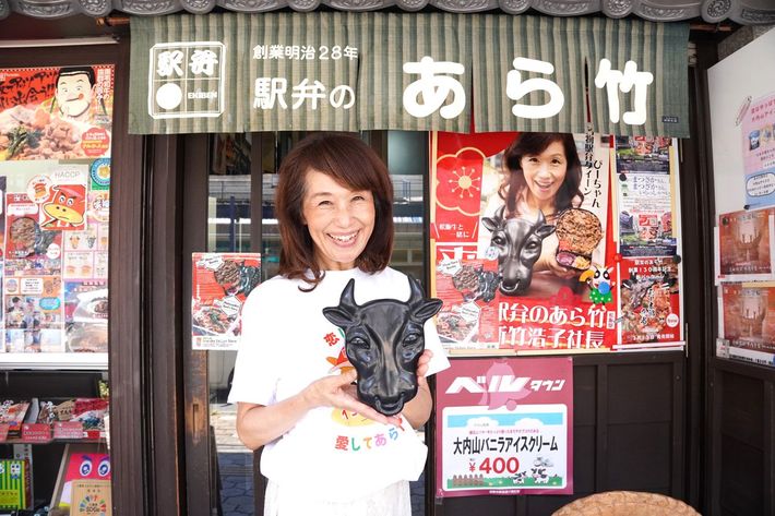 「モー太郎弁当」を手にする、あら竹社長の新竹浩子さん