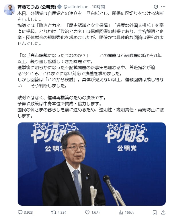 公明党代表・斉藤鉄夫氏のXより