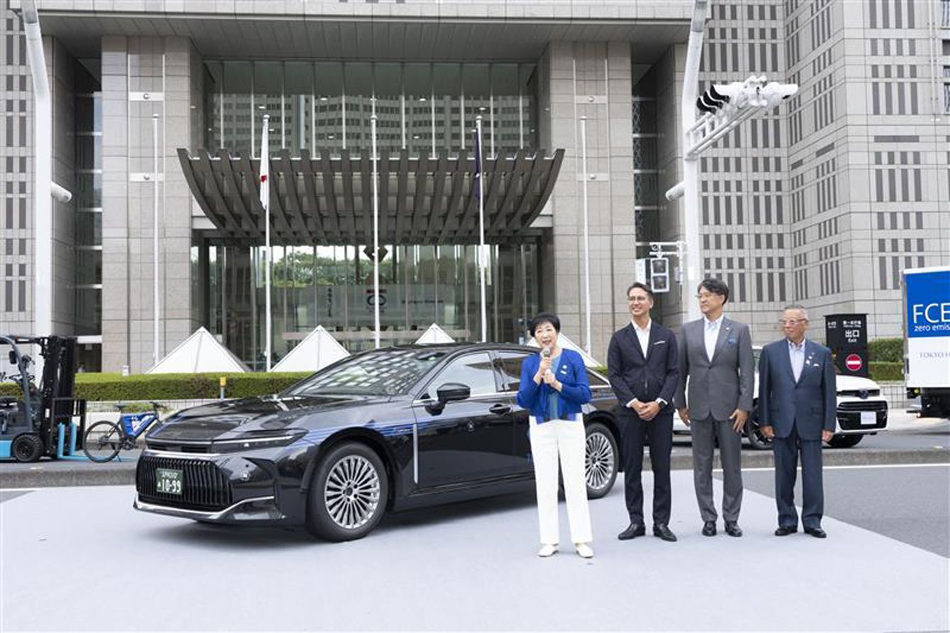 左から牧野明次岩谷産業会長兼CEO、佐藤恒治トヨタ自動車社長、小池百合子都知事、川鍋一朗一般社団法人東京ハイヤー・タクシー協会会長(日本交通取締役)
