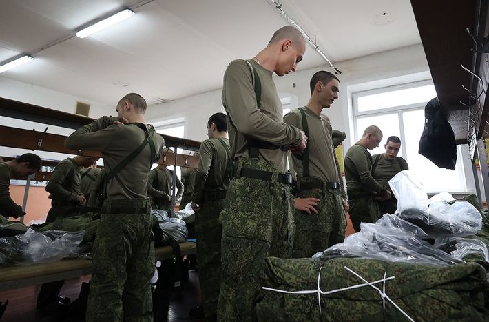 ロシア軍に召集された徴兵兵たちは、ロシアのクラスノダール駐屯地に向けて出発する前に、地元の徴兵センターで軍服を受け取る=2025年10月14日