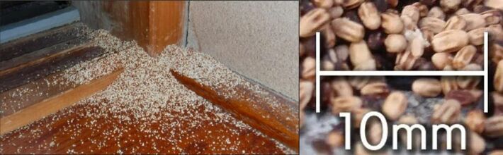 アメリカカンザイシロアリの糞粒。乾燥して硬く、よく見ると俵型でたてに筋が入っている。(提供=