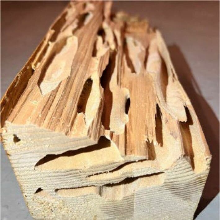 アメリカカンザイシロアリの被害。通常のシロアリ被害では年輪の間の柔らかい部分だけがくりぬかれるが、硬い年輪の部分も食べてしまう。(提供=