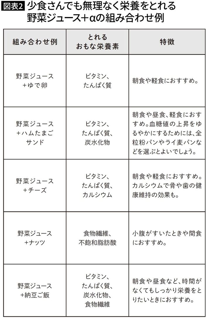 野菜ジュースだけでは栄養不足になるが、ほかの食品と組み合わせることで真価を発揮する(『