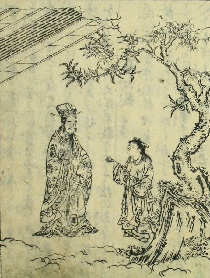 弥子瑕が食べかけの桃を霊公に食べさせている様子(写真=橘守国『絵本故事談』より/CC-PD-Mark/