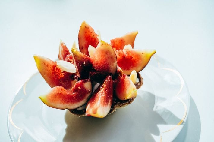 黒イチジクのタルト。イチジクの葉のクリーム、レモンリコッタチーズ、イチジクのコンポート、バルサミコ酢、アーモンドとエキストラバージンオリーブオイルなど、意外な素材の組み合わせで複雑な味わいを生み出している