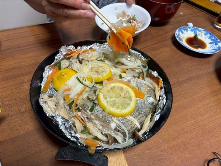 タカノハダイのフルコースとヘダイの刺身と塩焼きの後でも箸が伸びたのが「ヘダイの野菜蒸し」。野菜もたくさん食べられる