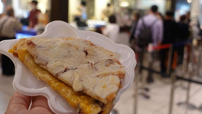 阪神百貨店の名物「イカ焼き」(187円)と「デラバン」(242円)。背後の店舗には長蛇の列ができている