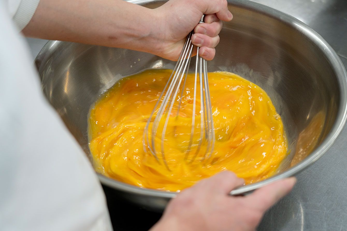 卵の攪拌も手作業で行われる