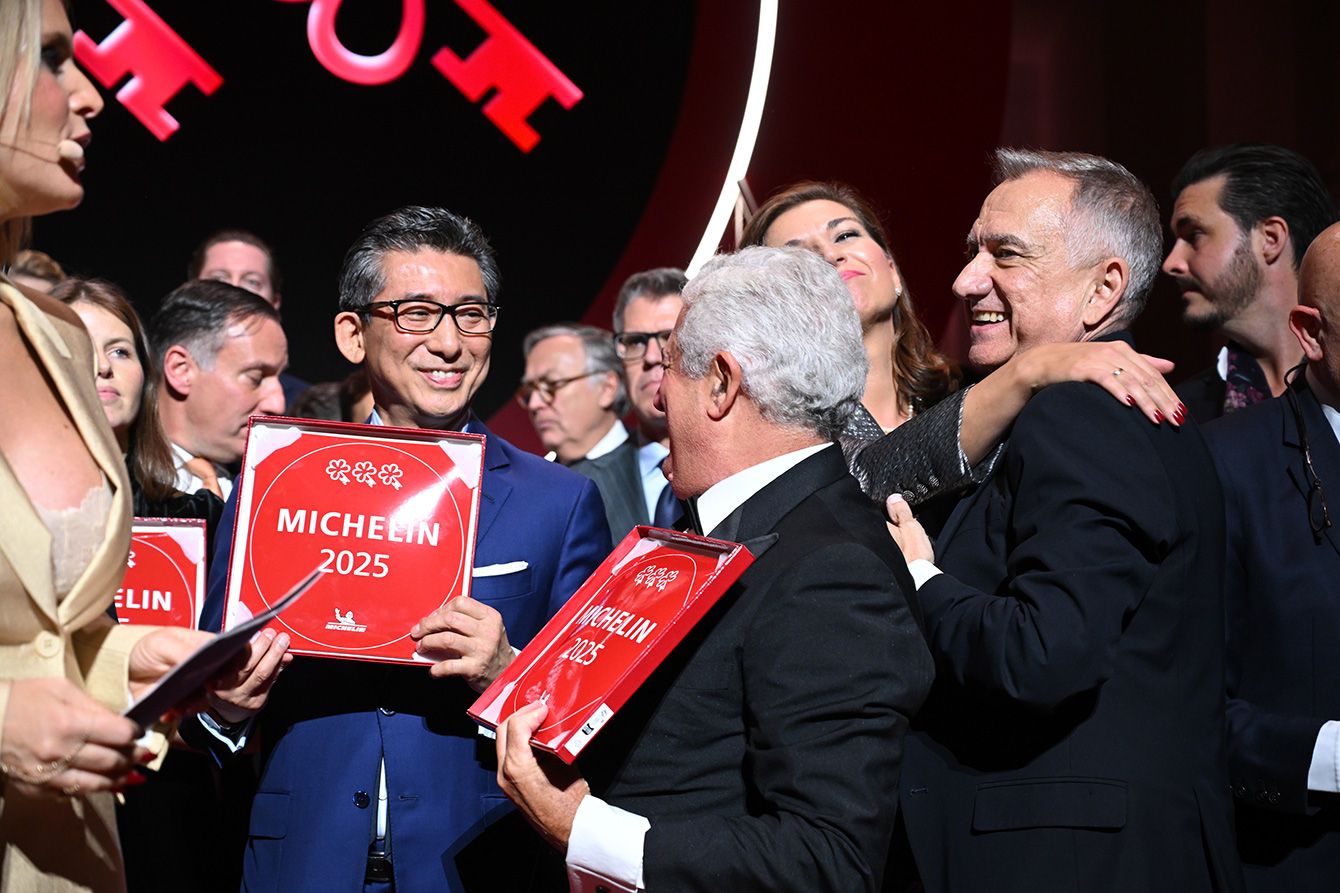 2025年10月8日(日本時間9日)にパリで開催された「ミシュランキー」授賞式の様子。壇上に並ぶホテリエ(ホテル従事者)たちは一様に素晴らしく姿勢がいいのが印象的。眼鏡姿の笑顔の男性は「パレスホテル 東京」の渡部支配人。