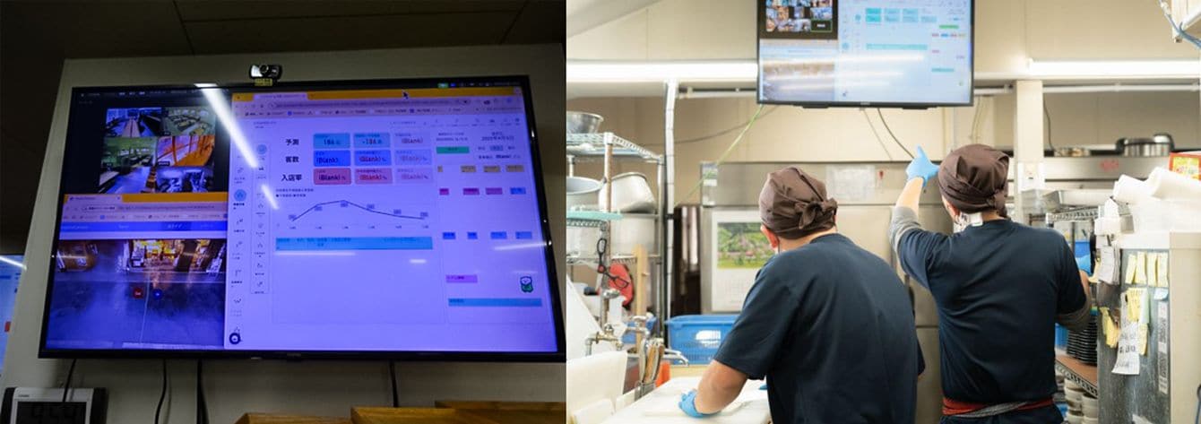 写真左=厨房に取り付けられた大型モニター(筆者撮影)/写真右=厨房にいながらその日のデータをリアルタイムで確認できる(写真提供=ゑびや)