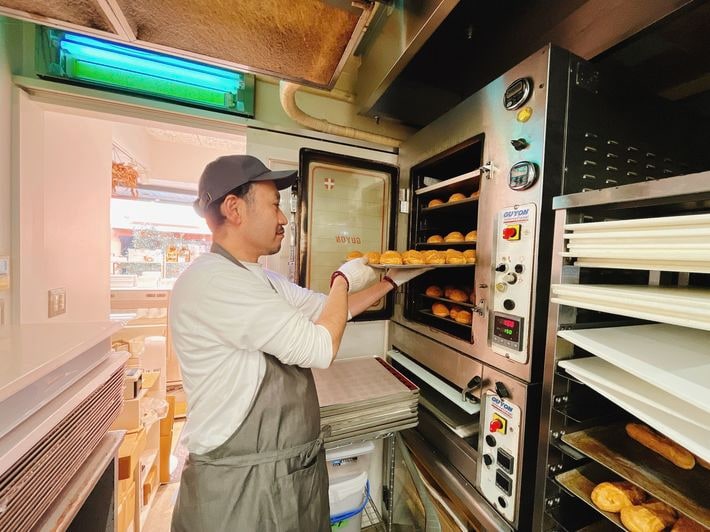 オーブンから焼き上がったシュークリームの皮を取り出す小澤さん