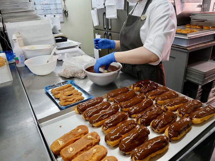 エクレアの製造風景。細長い形に焼いたシュー生地を、一つひとつ丁寧にチョコレートでコーティングしていく