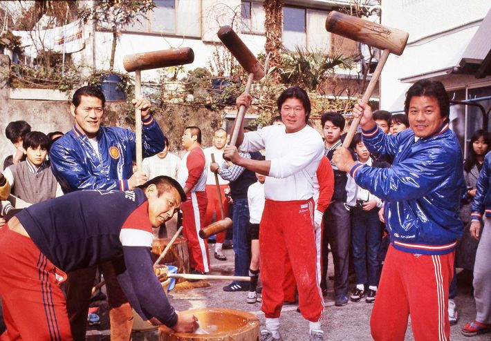 1984年12月25日、アントニオ猪木、坂口征二、藤波辰巳、木村健悟(写真右から二人目)を中心に行われた新日本道場での餅つき会。ファンも参加できる毎年の恒例行事となっている。