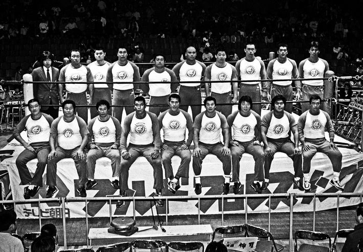 ※1982年11月20日、選手集合写真(後楽園ホール)。前列左から藤原、永源遙、星野勘太郎、坂口征二、猪木、藤波、木村健悟、剛竜馬、木戸。後列左から田中秀和リングアナ、栗栖正伸、後藤達俊、新倉史祐、荒川、ブラック・キャット、小杉俊二、山崎一夫、髙田、仲野信市