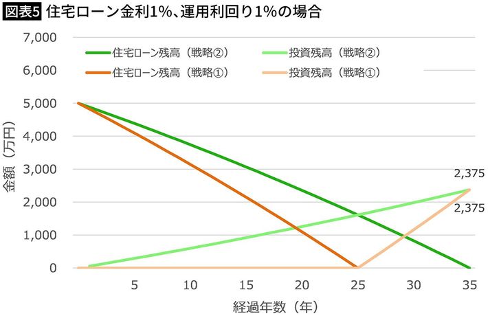 5000万円、金利1%で借りた際の2つの戦略(運用利回り1%)(図表=筆者作成)