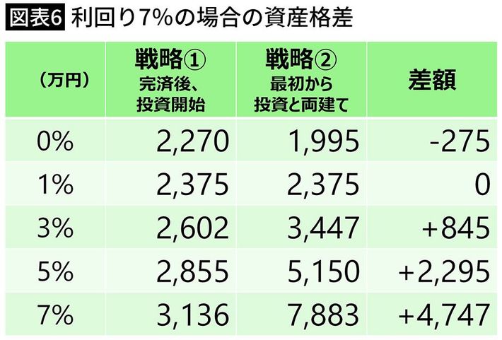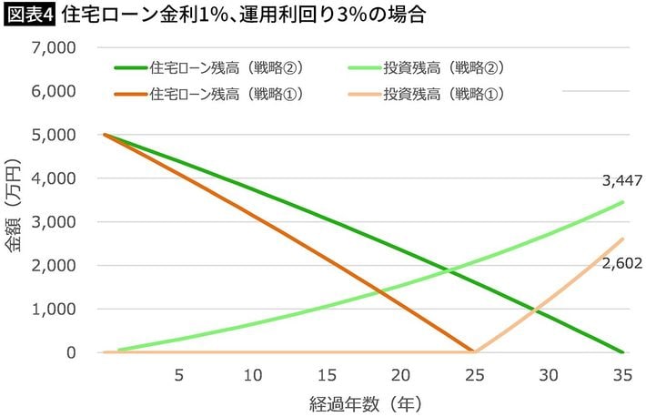 5000万円、金利1%で借りた際の2つの戦略(運用利回り3%)(図表=筆者作成)