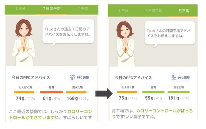 左がダイエット開始時、右が現在のアドバイス画面。オーバーしていた脂質が適正範囲内に