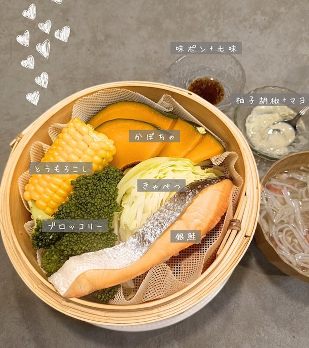この日のせいろ蒸しは鮭、キャベツ、ブロッコリー、とうもろこし、かぼちゃ。食べ飽きないように、コチュジャンや柚子胡椒、ナンプラーなどの調味料でタレに工夫を