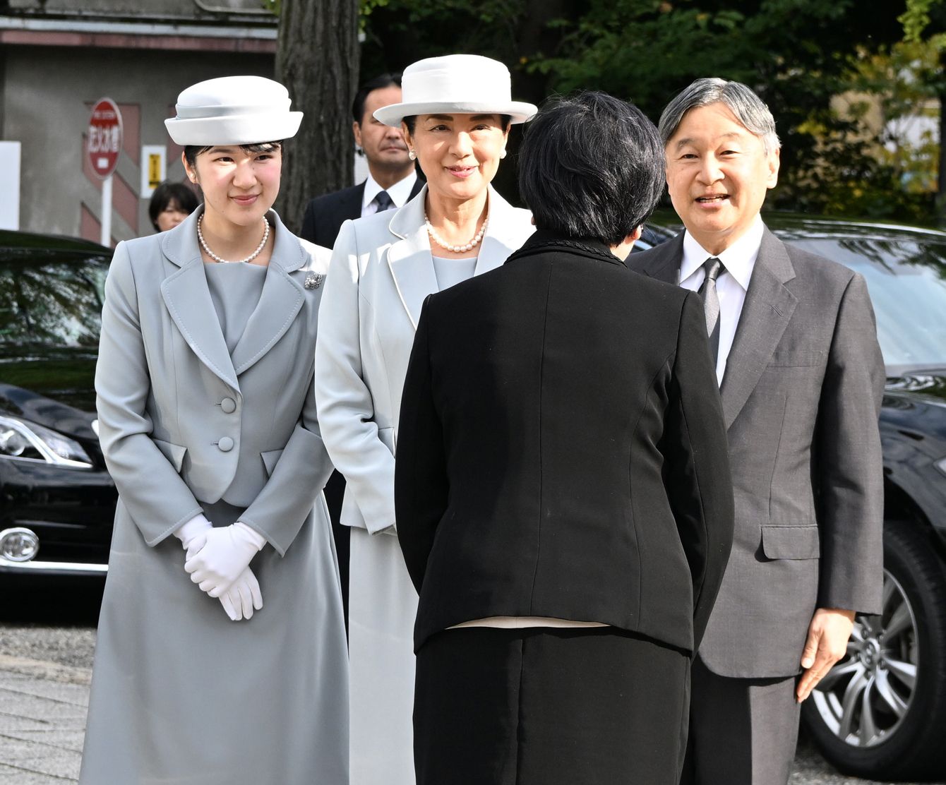 東京都慰霊堂に到着し、小池百合子都知事(手前)の出迎えを受けられる天皇、皇后両陛下と長女愛子さま。2025年10月23日、東京都墨田区[代表撮影]