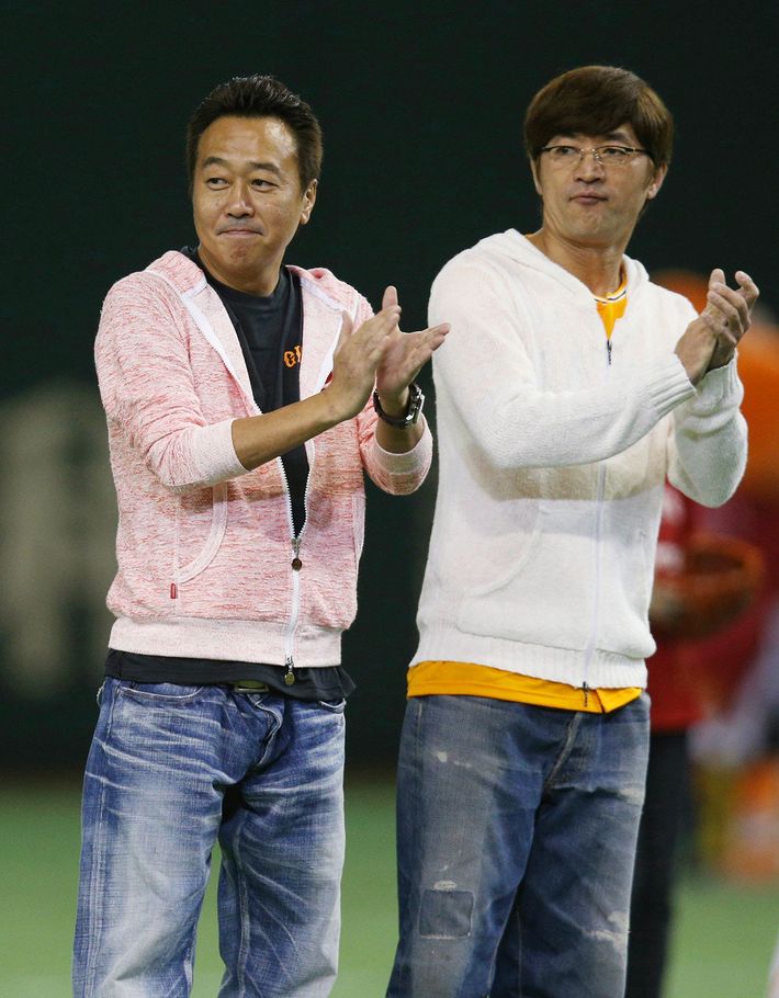 始球式に参加したお笑いコンビ「さまぁ~ず」の三村マサカズさん(左)と大竹一樹さん=2015年5月12日、東京ドーム