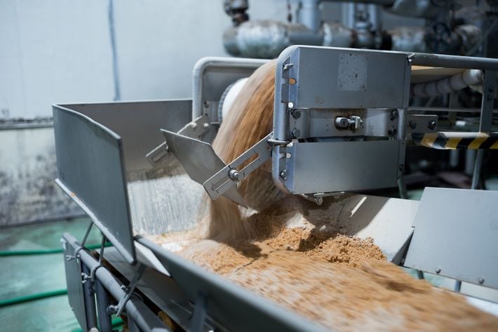 炒った麦と蒸した大豆が合わさり製麹室(せいきくしつ)へ運ばれていく