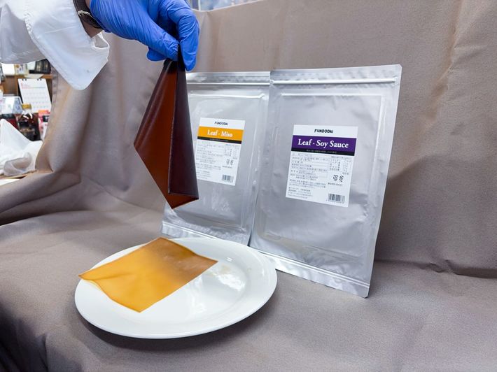 醤油を0.2ミリの極薄シートに加工した「リーフ醤油」。皿の上にあるのは「リーフみそ」