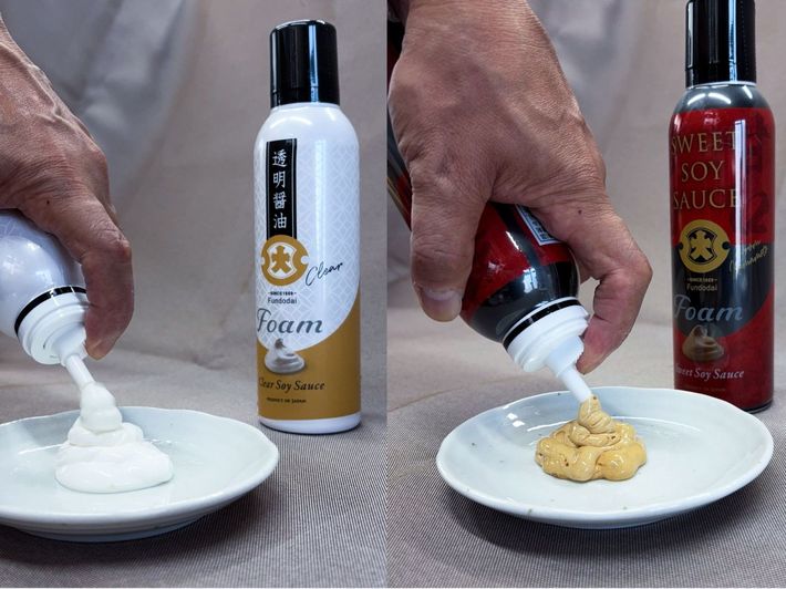 醤油をムース状にした「フォーム醤油」。左が透明醤油のムース版、右が甘口醤油のムース版