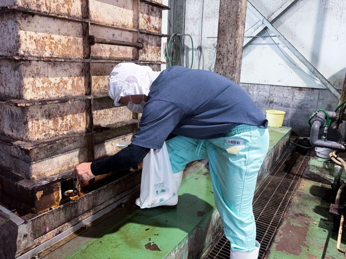 蔵で発酵したもろみを500枚の布に一枚一枚注ぎ込んでいく