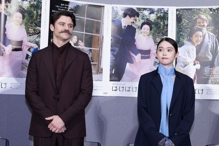 連続テレビ小説「ばけばけ」記者会見にて。ヘブン役のトミー・バストウ、トキ役の髙石あかり、2025年9月8日、東京都渋谷区のNHK
