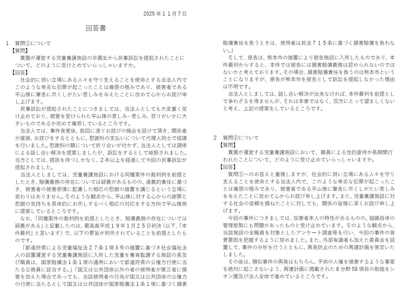 質問に対する慈愛園側の回答書