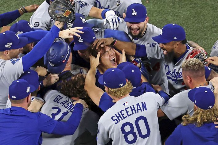 米大リーグ、ブルージェイズとのワールドシリーズ第7戦を制して2連覇を達成し、チームメートと喜ぶドジャースの山本由伸(中央)=2025年11月2日、トロント
