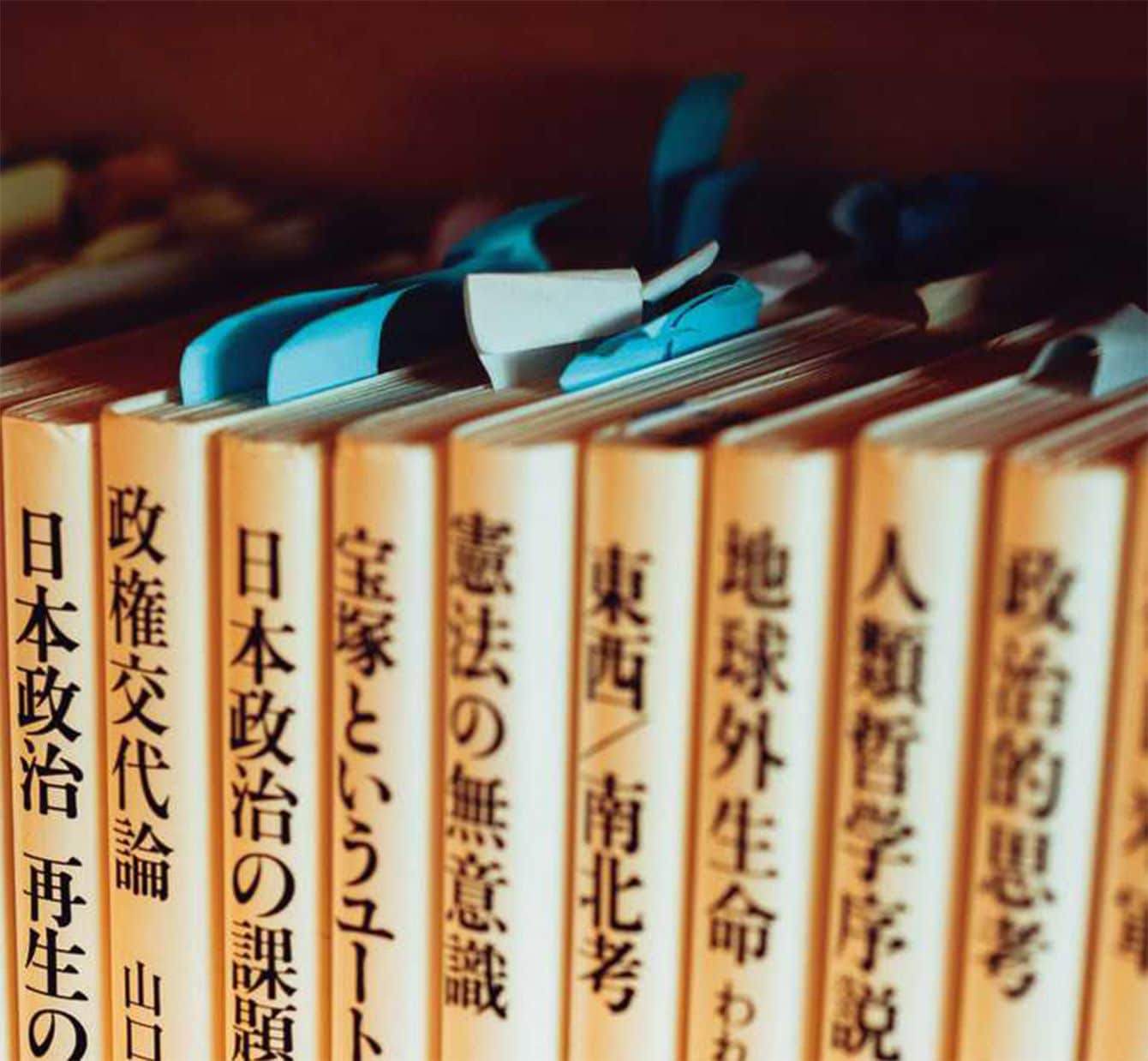 ゲンロンにある書棚の一角。東さんはメモを書き込む代わりに付箋で印をつけていた。