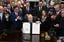 つなぎ予算案の修正案に署名したトランプ米大統領(中央)(=2025年11月12日、アメリカ・ワシントン)