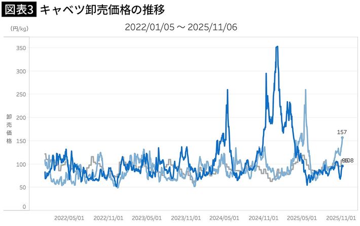 東京都中央卸売市場2022年1月5日~2025年11月6日。異常気象で高騰はあるものの、平時のキャベツ価格は横ばいで推移(図表=